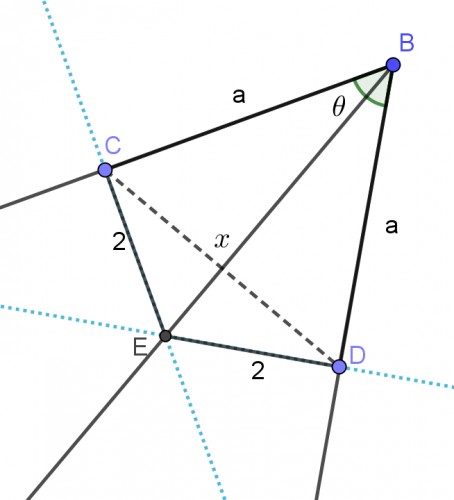 اگر زاویه$ \theta $ به طورمثال $ \theta =60^{ \circ } $ داشته باشیم باتوجه به شکل زوایای CBD و CED مکملند بااستفاده از قضیه کسینوس ها ابتدا x برحسب $ \theta $ وسپس a رابرحسب $ \theta $ به دست می آوریم و مسئله قابل رسم است