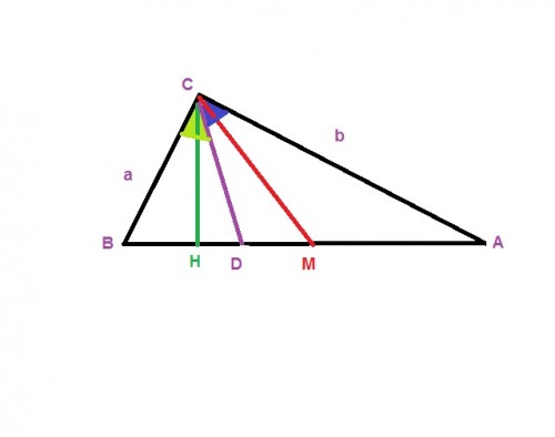 واین خلاف است زیرا اگر H بین DوM قرار گیرد باید $ \angle BCH > \angle ACH$ چون CD نیمساز است در نتیجه نقطه D بین MوH قرار دارد.