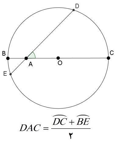 می دانیم اگر دو وتر دایره به نام های $DE$ و $BC$ همدیگر را در نقطه ای مانند $A$ قطع کنند آنگاه زاویه بین دو وتر یعنی $DAC$ از رابطه زیر بدست می آید: