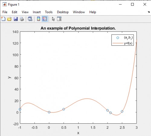 است (جملهٔ ثابت صفر بودهاست که نوشتنش فرقی ایجاد نمیکند). در زیر رسم نمودار این تابع به همراه ۶ نقطه توسط همان نرمافزار Matlab نیز آوردهشدهاست که میتوانید به صورت بصری نیز ببینید که تابع یافتشده از همهٔ نقاط خواستهشده میگذرد.