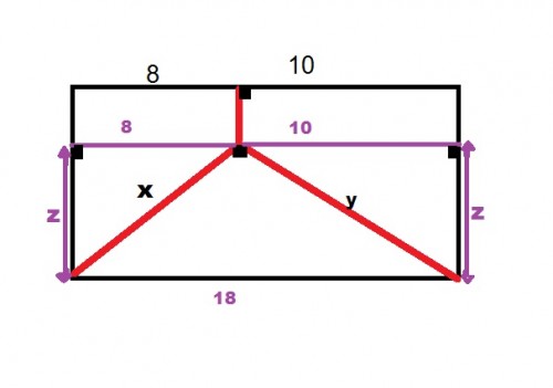 $ x^{2} + y^{2} = 18^{2} \Rightarrow z^{2} + 8^{2} + z^{2} + 10^{2} = 18^{2} $