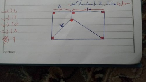مقدار x را بیابید. سوال درباره پیدا کردن زوایای مختلف هست. اما در اینجا فقط زاویه x داده شده است. 1) 10 2) 12 3) 15 4) 18 )5) 9