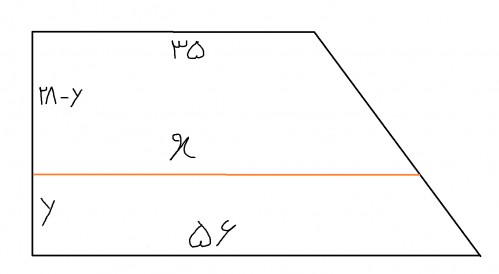 میخواهیم این زمین رو با رسم یک ضلع بین ضلع ۵۶ و ضلع ۳۵ به دو قسمت مساوی تقسیم کنیم بطوری که دو تا ذوزنقه قائم الزاویه داشته باشیم. طول ضلع تقسیم کننده چند متر باشد؟