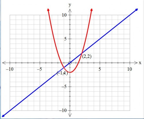 (1-,1-) و (2,2) خواهد بود طبق شکل نمودار y=x در بازه ی (2و1-)بالای نمودار $y=x^2-2 $ درنتیجه داریم