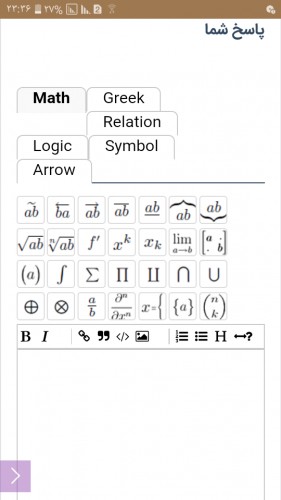 بر روی گوشی من صفحهٔ تایپ و ویرایش به شکل زیر نمایش داده می‌شود. چگونه می‌توانم از آیکن‌های این صفحه برای نوشتن فرمول‌های ریاضی و غیره استفاده کنم؟