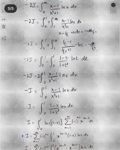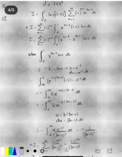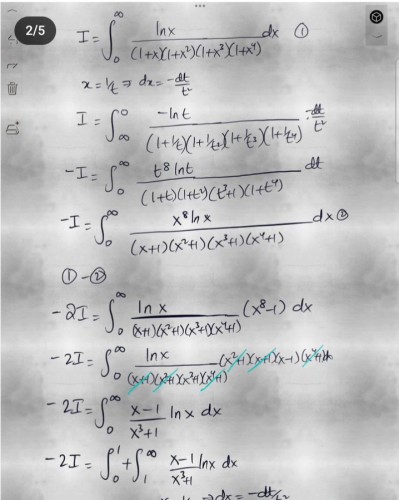 $= \int_0^ \infty \frac{(1-u^8)ln(u)}{(1+u)(1+u^2)(1+u^3)(1+u^4)} du- \int_0^ \infty \frac{ln(u)}{(1+u)(1+u^2)(1+u^3)(1+u^4)} du$