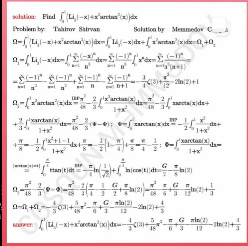 $ \Rightarrow \int _0^1Li_3(-x)dx= \int _{-1}^0Li_3(x)dx= \int _{-1}^0\sum _{k=1}^ \infty \frac{x^k}{k^s} =\sum _{k=1}^ \infty \int _{-1}^0\frac{x^k}{k^s}dx= \frac{(-1)^k(k+1)}{k^3} $