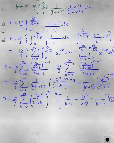 $$ \frac{10}{3} \sum_{n=0}^{\infty} \frac{(-1)^n}{2n+1} \left( \frac{\varphi^2}{3-\varphi} \right)^{n+\frac{1}{2}} $$
