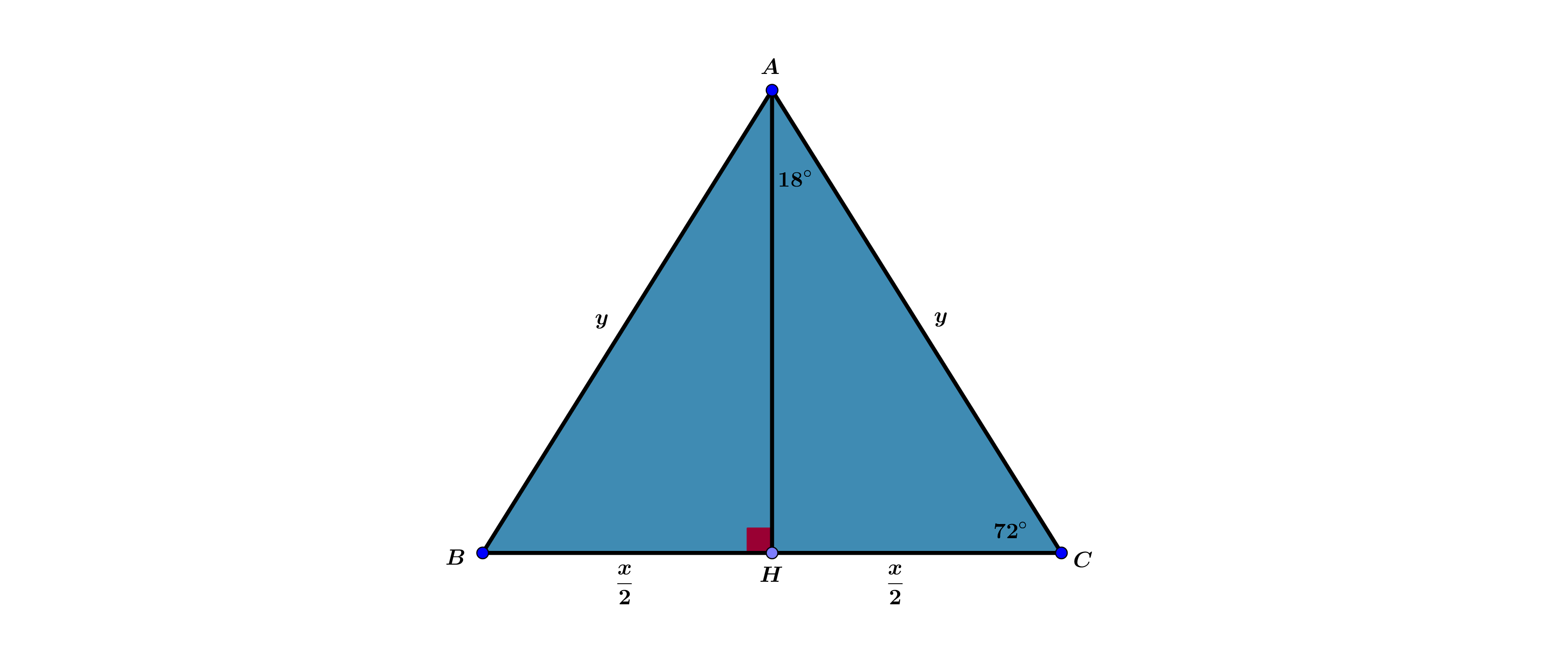 $$\sin 18^ \circ =\dfrac{\dfrac{x}{2}}{y}=\dfrac{\sqrt{5}-1}{4}$$